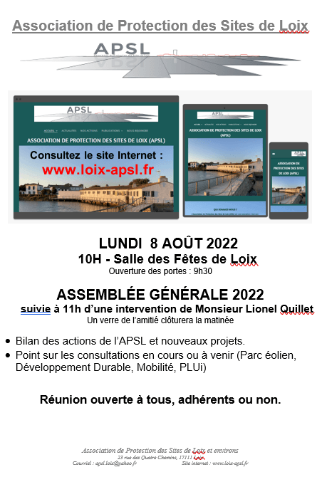 Vous êtes cordialement invités à participer à l'Assemblée Générale 2022 de l'APSL, qui se tiendra le lundi 8 Août à la salle des fêtes de Loix, à 10h précises, mais seuls les adhérents à jour de leur cotisation 2022 pourront se prononcer sur les résolutions présentées.